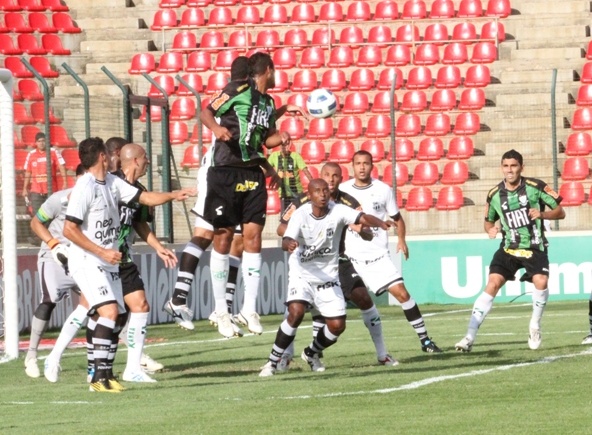 O primeiro tempo começou com o Vovô buscando o ataque. Logo aos três minutos, Osvaldo cobrou falta pelo lado esquerdo e Daniel Marques fez o desvio, mas o goleiro Neneca fez boa defesa. No rebote, Roger dominou e chutou, mas a zaga do América/MG travou o lance e afastou o perigo.