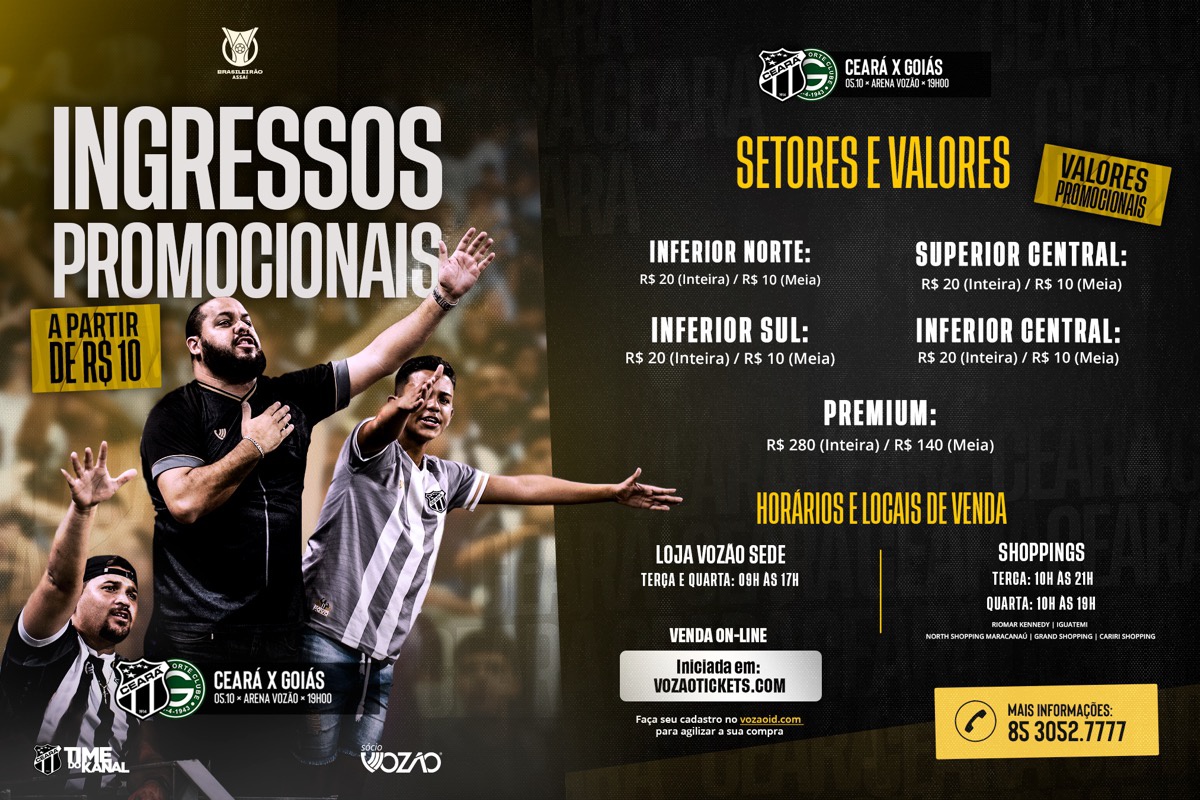 Na próxima quarta-feira (05), às 19h, o Ceará recebe o Goiás, na Arena Vozão (Castelão), em partida válida pela 30ª rodada do Brasileirão. Com valores a partir de R$ 10,00, a Nação Alvinegra já pode garantir o ingresso do jogo.