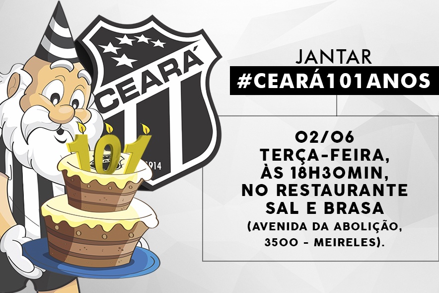 O ano do Centenário do maior clube do Estado está chegando ao fim, mas uma nova data especial se aproxima, afinal, no próximo dia 02/06 (terça-feira), o Ceará Sporting Club vai comemorar seus 101 anos de fundação e o torcedor alvinegro vai poder comemorar em uma festa inesquecível: o Jantar #Ceará101Anos.