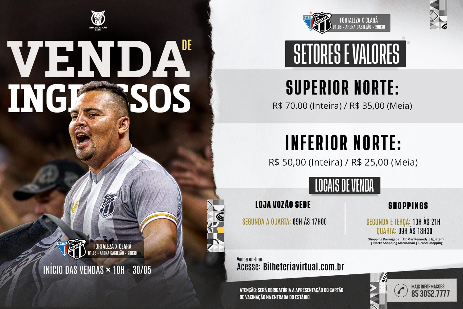 Na próxima quarta-feira, o Ceará enfrentará seu rival no primeiro Clássico-Rei da Série A 2022. A torcida do Mais Querido terá um percentual de 30% do estádio à disposição e as vendas de ingressos para o confronto terão início nesta segunda-feira, 30.